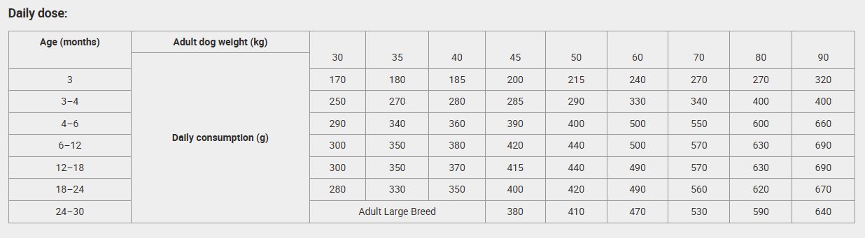 crude protein 28 %, crude fat 15 %, crude fibers 3 %, crude ash 5,8 %, moisture 9 %, calcium 1,3 %, phosphorus 1 %, sodium 0,4 %, magnesium 0,1 %, omega-3 fatty acid 0,4 %, omega-6 fatty acids 1,7 %
