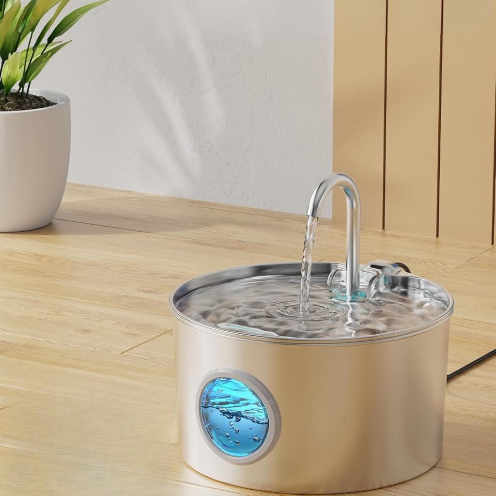 This stylish round stainless steel fountain with a capacity of 2.2 liters features LED lighting, a practical window for checking the water level, and two water distribution modes—with or without a tap—so you can choose how your pet drinks. Ideal for healthy drinking every day.